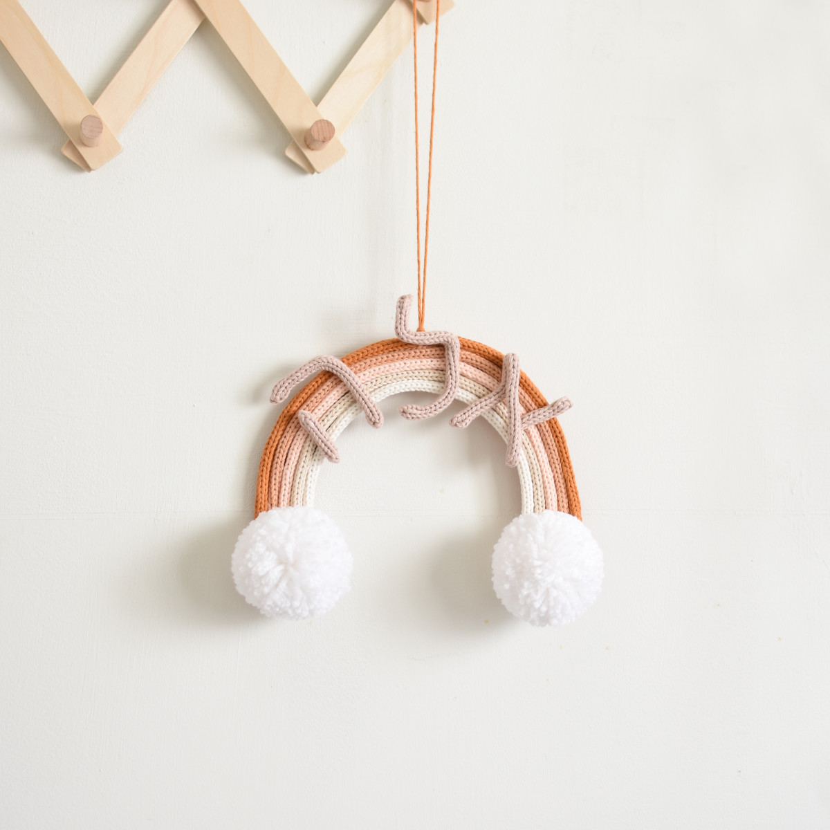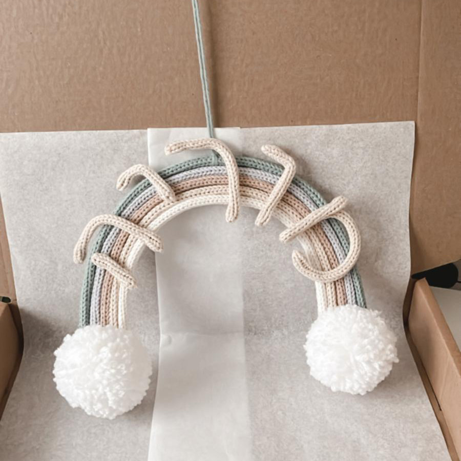 שם סרוג בעבודת יד על קשת בענן. קישוט קיר קסום לחדר הילדים!